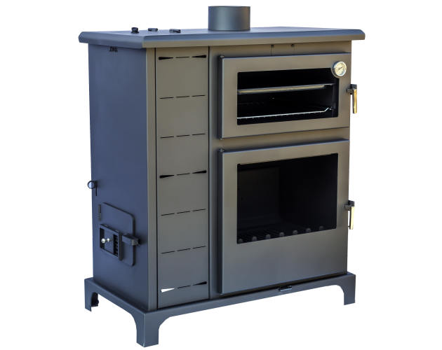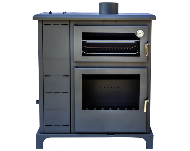 Stufa multicombustibile con forno in stile moderno e funzionamento a convezione naturale, che non richiede allacciamento elettrico.